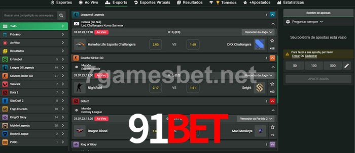 O 91Bet oferece uma grande seleção de opções de apostas em e-sports com probabilidades competitivas